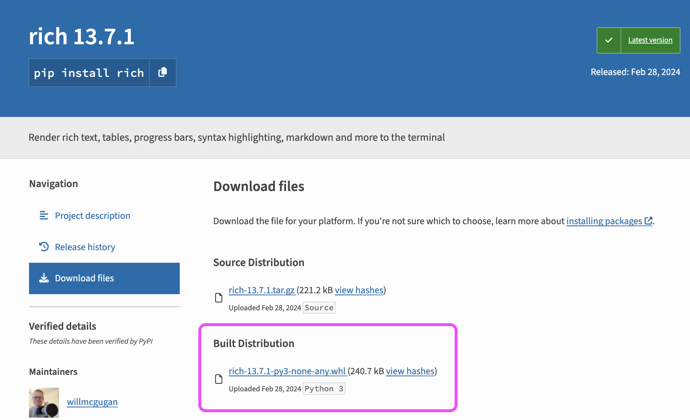 We say "probably" because that pure package could depend on a non-pure package which brings you to the next section. For example, pydantic is a pure package, but to work properly it requires pydantic-core non-pure package written in Rust.